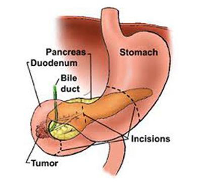 The duodenum is located adjacent to the stomach and connects to the liver towards the top and to the small intestine towards the bottom